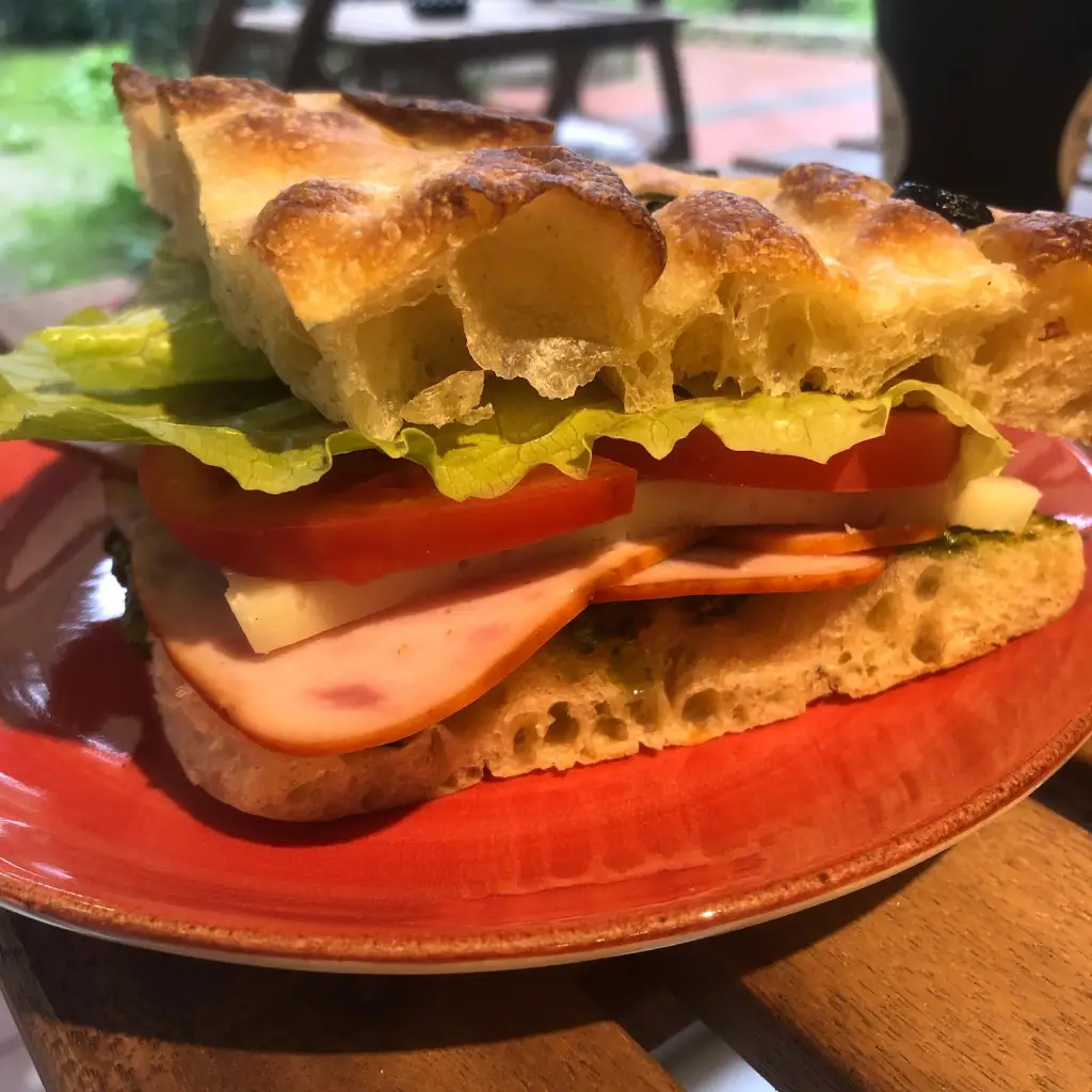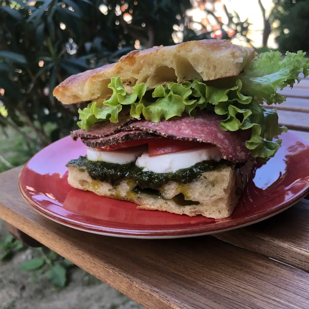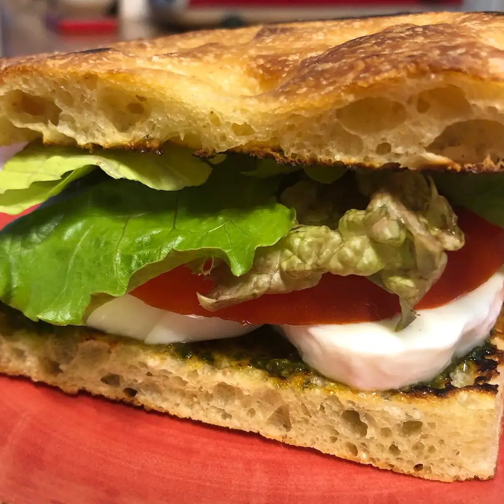 Suda mozzarella, pesto sos, domates, yeşillik, ekşi maya foccacia ile