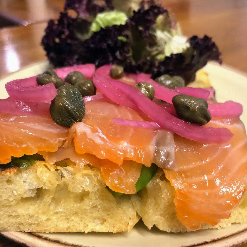Somon gravlax (ev yapımı), avokado, kırmızı soğan turşusu, kapari, marul, seçtiğiniz ekmek ile